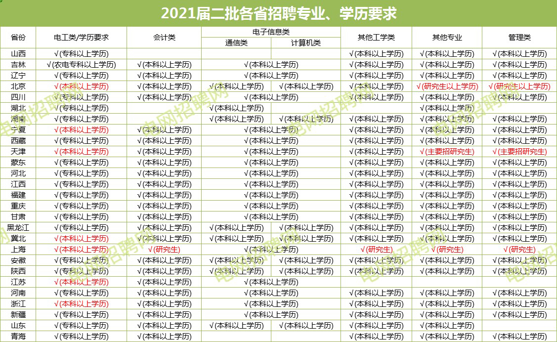 最后附上一張各省電網(wǎng)二批次各科對學(xué)歷層次的要求,大家先根據(jù)自己的情況看看自己達(dá)到入網(wǎng)門檻了嗎?