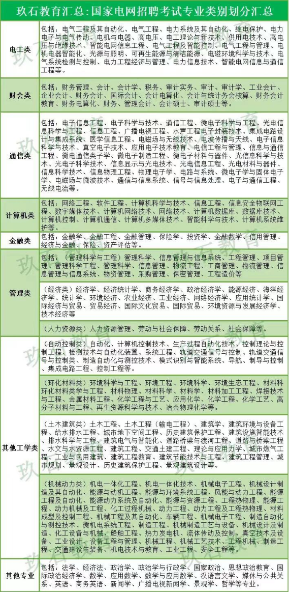 玖石君也發現網上總結的專業類別不是特別標準,就在國網考試報名系統中查詢了部分專業所屬的專業類別,匯總成以下專業分類,供考生們參考。