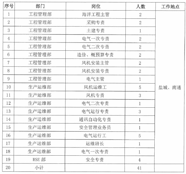 根據江蘇公司人力資源計劃,現為所屬單位國家電投集團江蘇海上風力發電有限公司"以下簡稱海上風電公司"相關崗位公開招聘。具體事項公告如下: