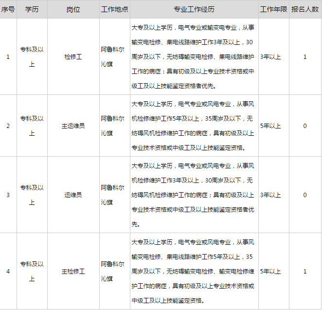大唐(赤峰)新能源有限公司隸屬于中國大唐集團有限公司,位于內蒙古自治區赤峰市,負責赤峰地區的風力發電、太陽能發電等新能源項目的開發、建設、生產運營。截止目前,公司已累計實現裝機151.03萬千瓦,投運10個風電場,共安裝9個風機廠家的14種機型風機1136臺。為保障公司發展需求,現面向集團公司系統內招聘專業人才,相關事項如下: