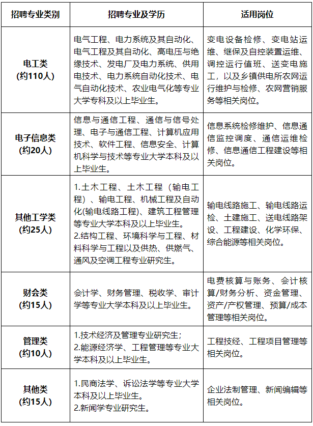 招聘專業指主修專業,不包含輔修專業。電工類招聘大學專科及以上畢業生,電子信息類、其他工學類、財務類、管理類和其他類招聘大學本科及以上畢業生。具體招聘計劃如下: