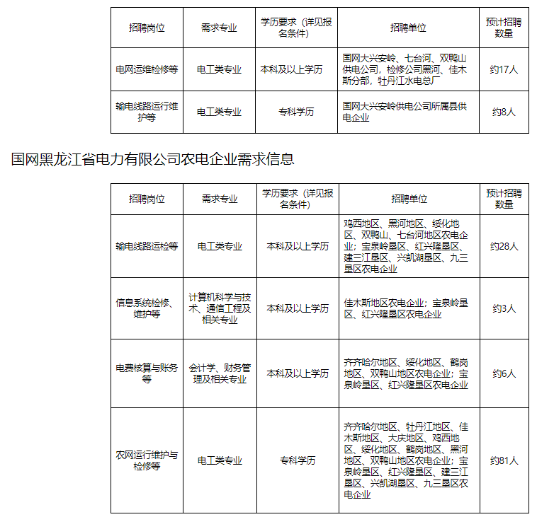 3.需求單位擇優招聘本科及以上學歷畢業生,縣供電企業鄉鎮供電所招聘電工類專科畢業生。