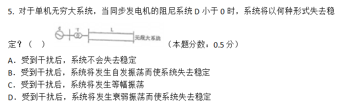 如SEq>0,則D的正負決定系統是否穩定:D>0時,系統總是穩定的,因D不是很大,x為負實部的一對復數,△和△作衰減振蕩;D<0時,系統不穩定,一般λ為正實部的一對復數,△δ和Δω作作振蕩發散,即系統振蕩。所以本題選B, 受到干擾后,系統將發生自發振蕩而使系統失去穩定。